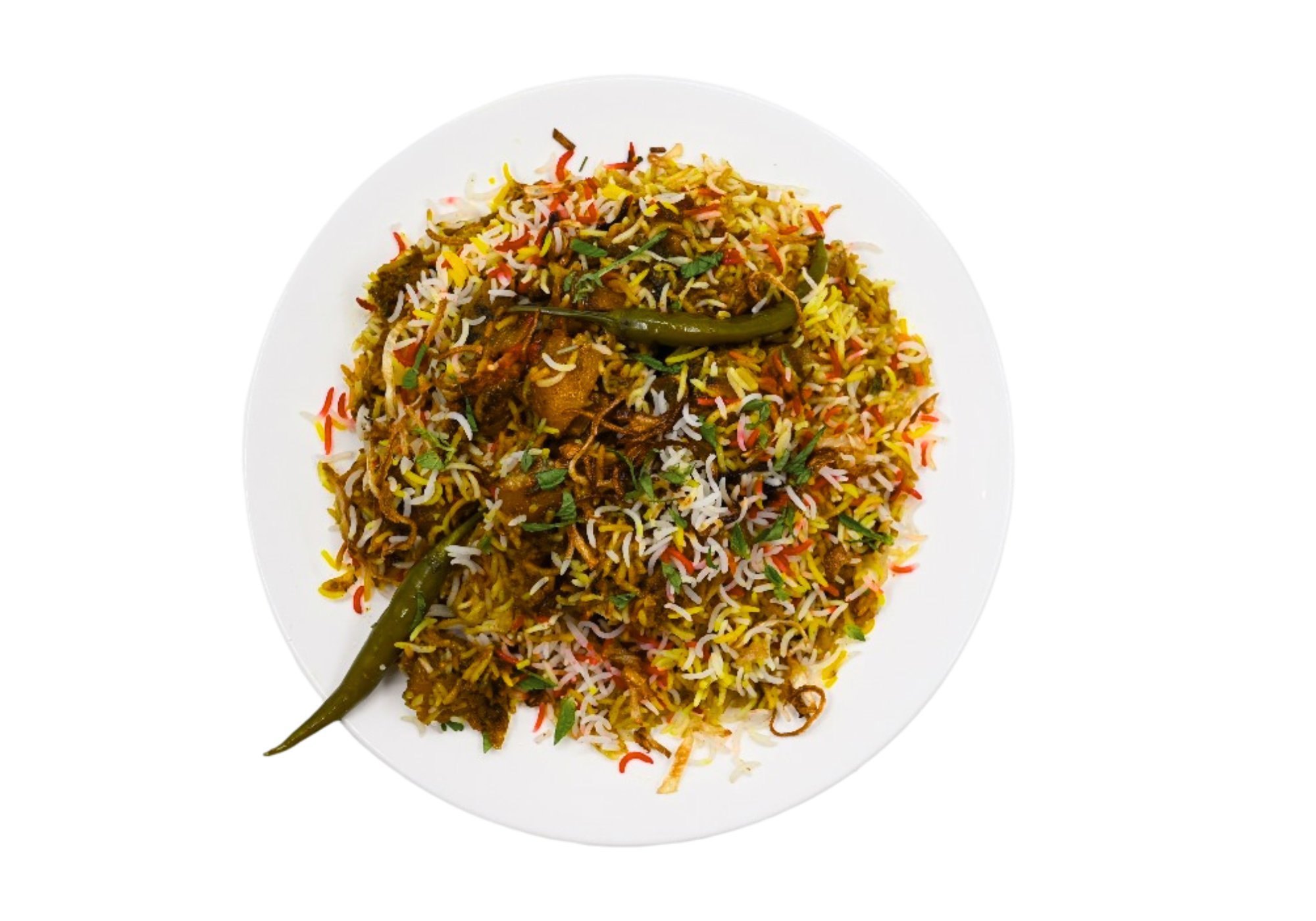 أرز بسمتي مسبك مع اللحم المتبل، بطاطس، بصل مقلي، وبهارات الزربيان